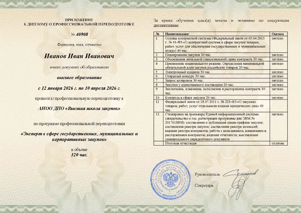 Вы получаете диплом о профессиональной переподготовке с присвоением квалификации эксперта. Сведения об обучении в Туле в обязательном порядке вносятся в реестр Рособрнадзора, подтверждая ваше право занимать руководящие должности в контрактных службах.