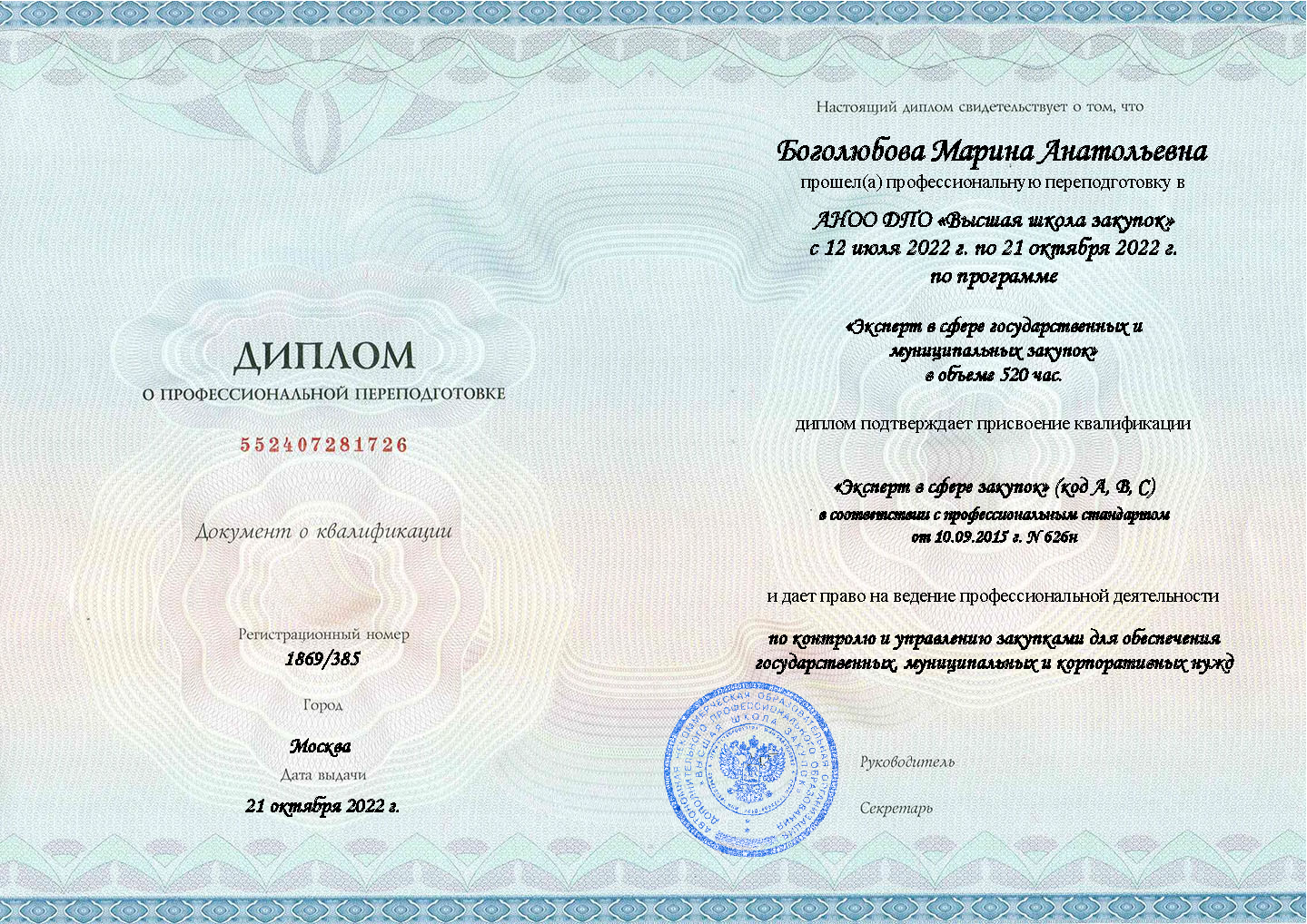 Слушателям, прошедшим обучение, присваивается квалификация «Эксперт в сфере закупок» (код A, В) в соответствии с Профстандартом от 10.09.2015 г. N 626н